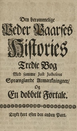 Jeg har for 2 eller 3 Maaneder siden kundet lade denne 3die Bog komme for Lyset, men er derfra bleven afskrecket, saasom jeg har fornummet, at en Landsbye-Degn har udi et haard Skrift ivret sig saa meget mod denne Historie, hvilket er saa meget des farligere, efterdi det got Folk kand lettelig indbilde gemeene Almue, at, naar mand skiemter med en Degn, som det høye og vigtige Embede er betroet, at sige Amen udi Kirken, mand da nødvendig ogsaa skiemter med ReligionenValete plurimum.Far meget vel